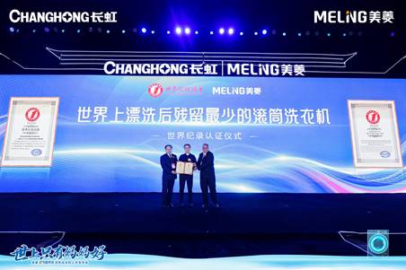 現場演示藍氧如手洗洗衣機去殘留挑戰后,在世界紀錄認證官和廣大觀眾的見證下,長虹美菱總裁鐘明現場接過《世界上漂洗后殘留最少的滾筒洗衣機》證書,繼如手洗洗衣機之后,美菱“藍氧如手洗”洗衣機再創世界紀錄。通過“藍氧去殘留技術”,一舉奠定“藍氧如手洗”系列“凈、護”的產品心智,促進洗衣機研發升級至“呵護”、“潔凈”層面,為用戶帶來更健康、更科學的生活,推動洗衣機產業高質量發展。