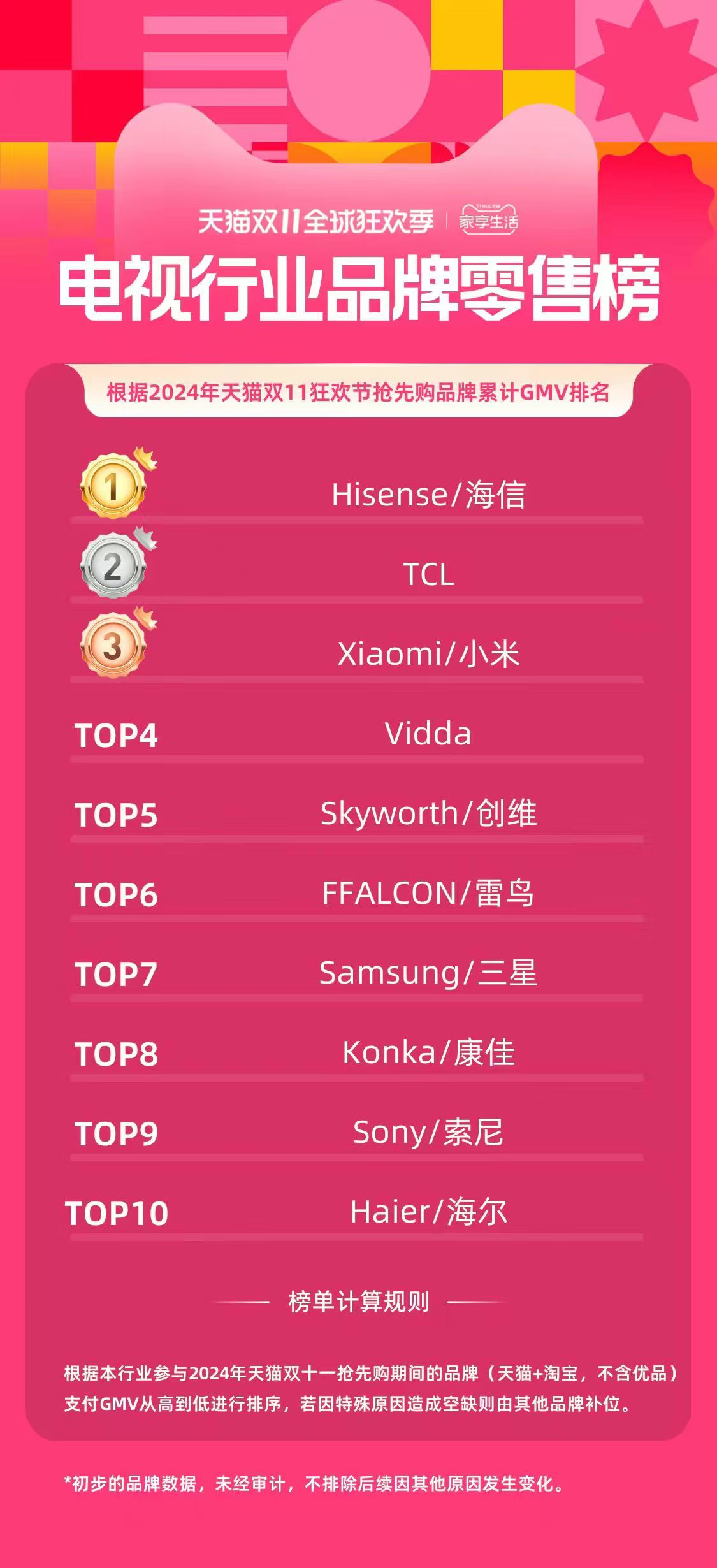 可以說這波國補+企補+平臺補,直接把大家買新家電的熱情徹底點燃,許多家庭用了多年的冰箱、電視、洗衣機等大家電都得到了全新升級,尤其是作為家庭影音娛樂中心的電視更是如此。在這次的天貓雙11搶先購中,國產品牌海信電視取得了開門紅,在電視行業品牌零售榜上穩居第一。旗下的海信電視E7N憑借著AI好畫質、好體驗以及百吋大屏的優勢,成為了消費者換新電視的優選。