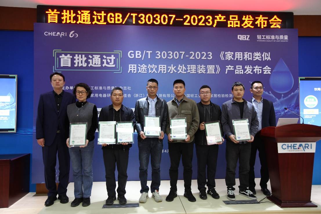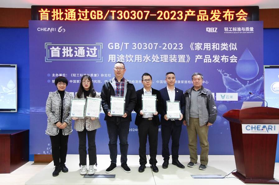 會上頒發了通過新國標GB/T 30307-2023檢測的產品檢測報告。經中國家用電器研究院環境與健康相關產品檢測所的專業檢測,首批共有15個品牌的17款凈水產品通過GB/T 30307-2023《家用和類似用途飲用水處理裝置》,分別是美的2款產品,安吉爾2款產品,VASEN、九陽、飛利浦、林內(Rinnai)、720、VIOMI、家樂事、碧云泉、萬家樂、聚倍、益之源、Makergood、濱特爾各1款產品。上述產品同時被《輕工標準與質量》雜志評為輕工對標產品,代表了目前凈水產品先進技術水平。