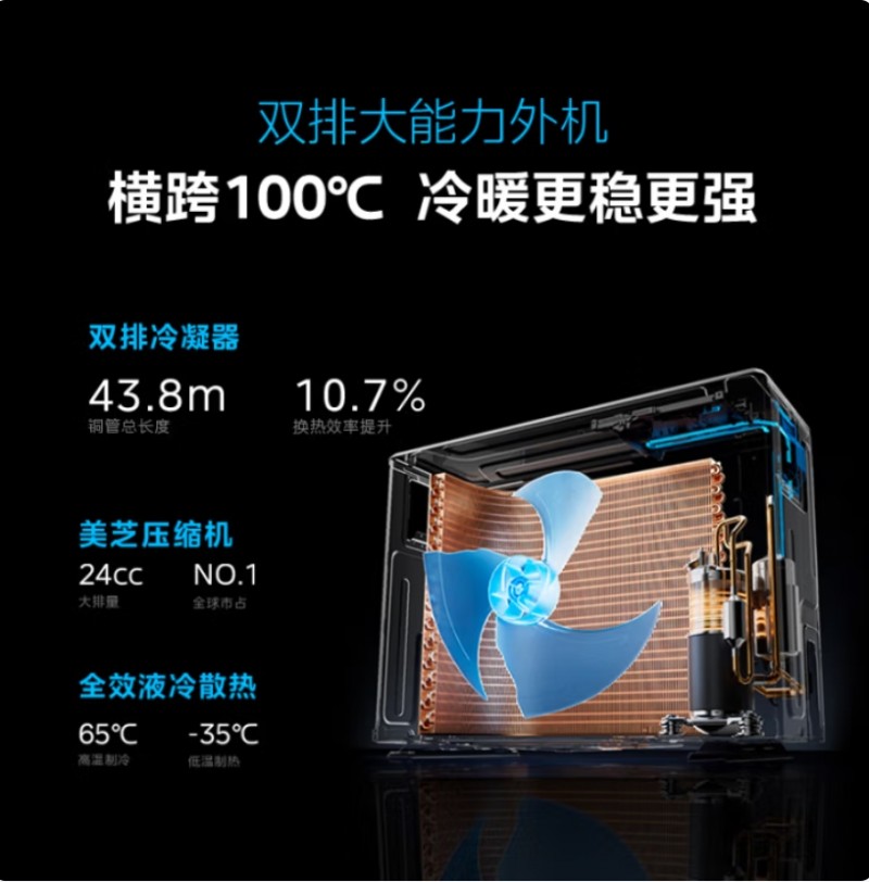強(qiáng)勁的性能離不開硬核的配置。美的全面風(fēng)空調(diào)擁有大功率電機(jī)、大直徑薄翼風(fēng)輪、創(chuàng)新的L型低阻蒸發(fā)器,保證了空調(diào)更大的風(fēng)量、更足的動力、更快的換熱效率。同時(shí),美的全面風(fēng)空調(diào)還擁有一個(gè)雙排大能力外機(jī),24CC大排量美芝壓縮機(jī)+大雙排冷凝器+電子膨脹閥,不管制冷還是制熱,都能更快、更猛、更穩(wěn)。不僅如此,美的全面風(fēng)空調(diào)的外機(jī)還搭載了自研的全效液冷散熱系統(tǒng),散熱效率比與傳統(tǒng)的“風(fēng)冷散熱”快5倍,可在-35℃至65℃的寬溫域區(qū)間穩(wěn)定運(yùn)行,橫跨100℃極限溫度不停機(jī),相當(dāng)于給外機(jī)安裝了一臺“空調(diào)”。