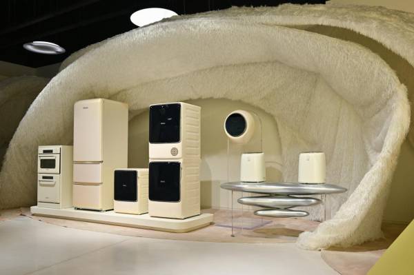 緊鄰水滴裝置的“破繭成蝶”展區,宛如一個夢幻與現實交織的空間,該裝置由無數片金屬絲線和無數白色羽毛編織而成,像繭房一般純凈、自由、錯落有致。陳列著的是MINIJ全家福——從小復古冰箱,法式四門復古冰箱,意式三門復古冰箱,到蒸烤炸燉一體機、洗碗機等復古廚房套系,再到小吉洗衣房家族:洗烘套,迷你落地洗衣機,壁掛洗衣機,及內衣洗烘一體機等,感受到MINIJ小吉在細分賽道上極致的追求,和擁有“全屋小吉”電器的高顏值、藝術化、熠熠生輝的家居場景。