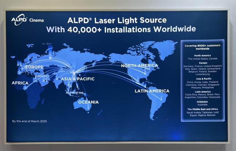 資料顯示,截至2025年3月,ALPD激光放映光源全球市場安裝量已突破4萬套,服務客戶超9000家,市場覆蓋范圍涵蓋北美、歐洲、亞太、中東、非洲以及拉丁美洲等地區。眾多影院紛紛引入該光源,為觀眾帶來更優質的觀影體驗。