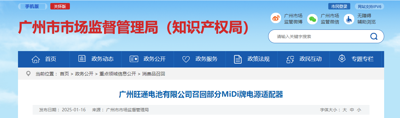 家電消費網2月8日訊 昨天,廣州市市場監(jiān)管局發(fā)布一則召回公告,涉及廣州旺通電池有限公司召回部分MiDi牌電源適配器。