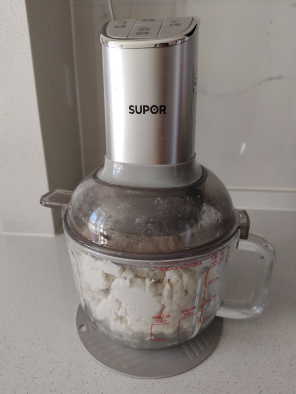 筆者首先對和面功能進行了體驗。2.5升玻璃杯的面粉投入上限為500g,說明書上給出的面水比例為2:1,就選擇了加入500g面粉和250ml水。裝上和面桿,在操作面板上按下“和面”按鍵,就看到時間窗口實時顯示工作時間。到了60秒,筆者松開按鍵,通過玻璃杯看到面粉已經成團了,成團時間比宣傳的2分鐘成團還要短,讓筆者很是滿意。