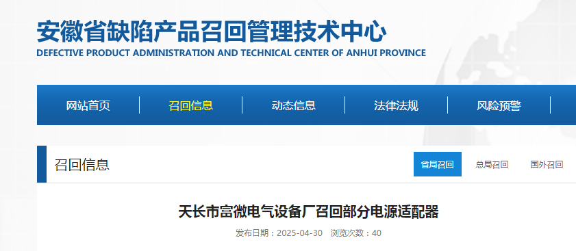 富微電氣召回500只電源適配器 存觸電安全隱患