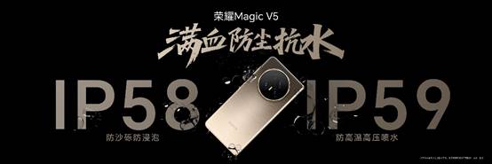 在可靠性方面,榮耀Magic V5搭載新一代金剛巨犀玻璃,防摔、防磨、防刮;滿血防塵抗水,全系支持IP58和IP59。