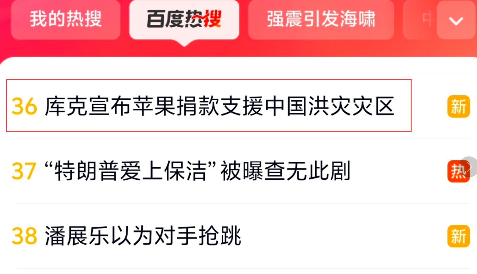 “庫克宣布蘋果捐款支援中國洪災災區”沖上百度熱搜