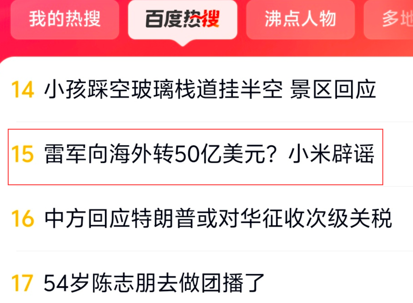 “雷軍向海外轉50億美元?小米辟謠”沖上百度熱搜
