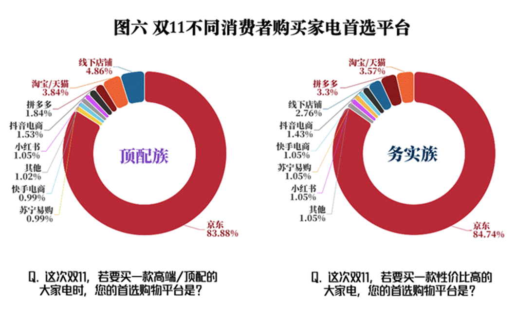 調查數據顯示,在平臺選擇上,多樣化供給和優秀的綜合服務能力,使京東成為不同類型消費者的首選。對優先購買高端/頂配大家電的“頂配族”,83.88%的受訪者首選京東購買家電,認可其“家電消費主場,新品大牌首發和品質信賴”的定位,排名其后的為線下渠道,具備“可實地體驗”的優勢,以及淘寶/天貓,以“活動廣、品牌選擇多”的特點吸引消費者。而對購買高性價比大家電的“務實族”,京東仍是84.73%的受訪者的首選,認為其“補貼直給、型號齊全、服務可靠”;排名其后的是淘寶/天貓和拼多多。