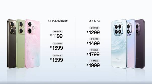 全新發布的 OPPO A5擁有「云母藍」「晶鉆粉」「鋯石黑」三款配色,8+128GB版本售價 1299 元,8+256GB 版本售價 1499 元,12+256GB 版本的售價 1799 元,12+512GB 版本售價 1999 元。