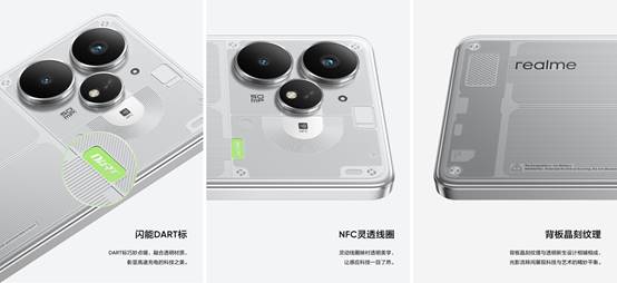 設計細節上,真我Neo7 Turbo采用激光精雕多紋理拼接工藝,讓每一處線圈走向和紋理細節,都以極具秩序感的方式呈現在眼前。透明背板近乎1:1還原內部精密排布,晶刻紋理、NFC線圈以及閃能DART標三大元素,做到了科技美學與功能性相融合,撞色的閃能 DART 標,釋放出強勁而鮮活的科技生命力,同時也致敬了真我閃充的越級之路。