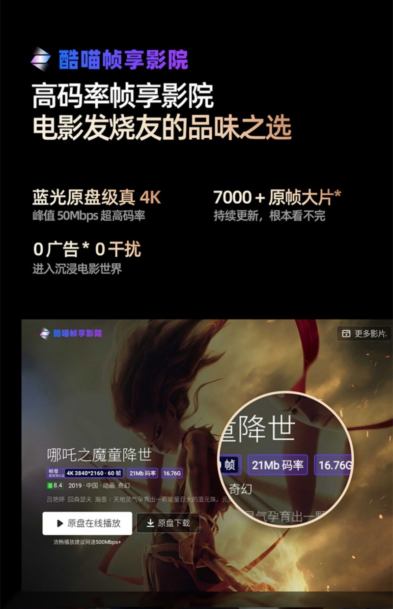創維在加強外部合作的同時,為了進一步滿足影音發燒友對高品質內容的高需求,還行業首發了酷喵幀享影院。創維A6F Pro通過內置高碼率幀享影院,直接擁有超7000部4K原幀大片,每一部碼率都超50Mbps,而且全程0廣告、0壓縮,聯網就能流暢播放無卡頓。
