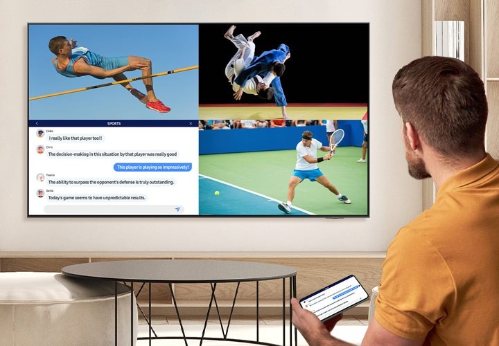 對于體育愛好者而言,同時追蹤多場賽事動態(tài)又不耽誤與朋友實時討論是常見需求,三星AI電視新 Tizen 智能系統(tǒng)支持的多視窗模式恰好能夠滿足。多種熱門賽事可同時在三星AI電視屏幕上呈現(xiàn),不錯過任何一場賽事的奪冠瞬間;用戶還可將移動設備投屏到AI電視上,實時與朋友互動、查看賽事數(shù)據(jù)等內(nèi)容,為深度體育迷提供全面的信息支持。