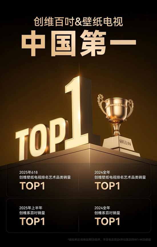 而創維電視在消費市場的卓越成績,也印證了這一來自國家最高級別認可的含金量。許多基于對“閱兵電視”這一認證的信任,紛紛選擇創維產品。據奧維云網(AVC)全渠道監測數據,創維系電視在2024年全年及2025年上半年,均位居中國百吋電視銷量首位。在融合家居美學與前沿科技的藝術電視領域,創維壁紙電視同樣表現卓越,獲2024年全年及2025年“618”期間藝術電視品類銷量第一。